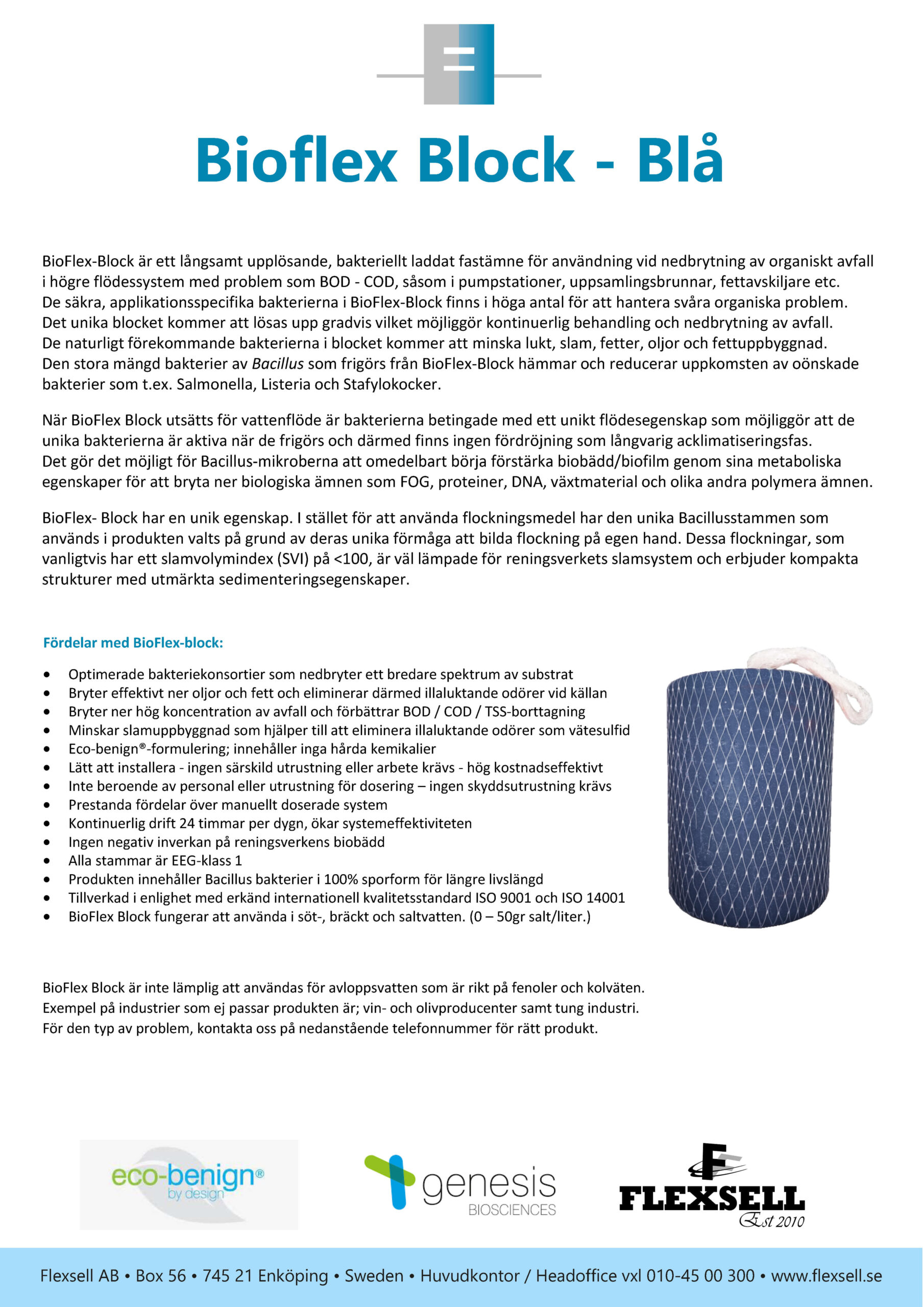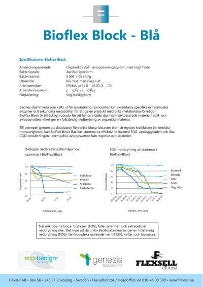 Bioblock är ett långsamt upplösande, bakteriellt laddat fastämne för användning vid nedbrytning av organiskt avfall i högre flödessystem med problem som BOD - COD, såsom i pumpstationer, uppsamlingsbrunnar, fettavskiljare etc. De säkra, applikationsspecifika bakterierna i Bioblock finns i höga antal för att hantera svåra organiska problem. Det unika blocket kommer att lösas upp gradvis vilket möjliggör kontinuerlig behandling och nedbrytning av avfall. De naturligt förekommande bakterierna i blocket kommer att minska lukt, slam, fetter, oljor och fettuppbyggnad. Den stora mängd bakterier av Bacillus som frigörs från Bioblock hämmar och reducerar uppkomsten av oönskade bakterier som t.ex. Salmonella, Listeria och Stafylokocker.