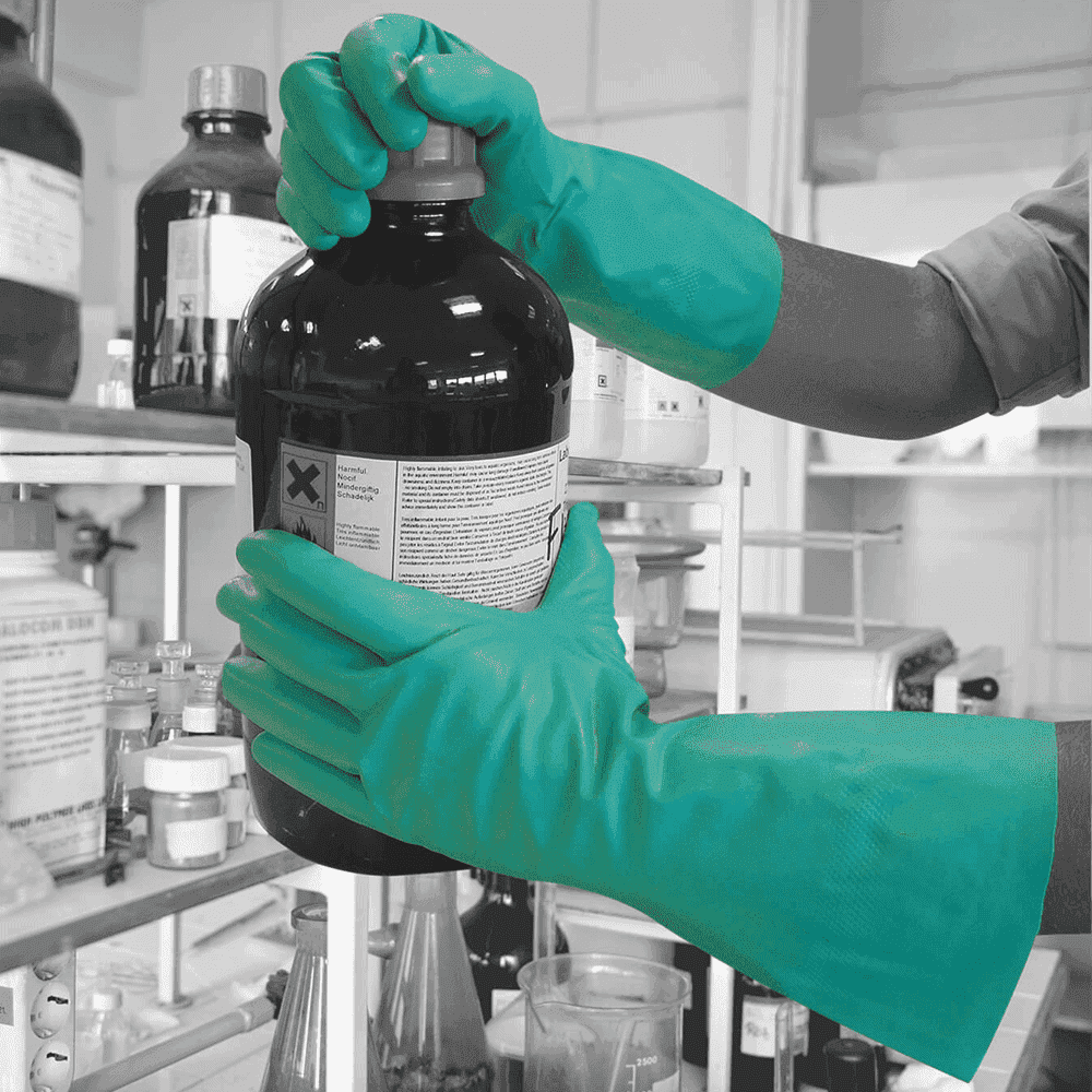 Matrix Nitrichem är en kemhandske i nitril med flossat foder, extra lång krage och bra grepp.